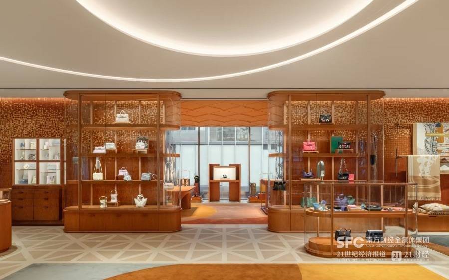 21世纪经济报道记者4月实地走访看到,这栋楼高五层,玻璃幕墙外包玫瑰粉与赤褐色瓷砖,灵感来源是紫禁城。外立面半透明,光能透进来,但每层都是一个独立的世界。运营逻辑显然也颇费心思,地下一层陈列鞋履、丝巾、香水和美妆,用最高频的品类来吸引更多用户的关注。而一层布局则是马术系列、时尚珠宝,二层陈列男女成衣、私人试衣间和贵宾室。此外,最核心的皮具、腕表等品类则放在了第三层。与其他门店不同的是,顶层的景观露台则设计为私人沙龙,接待VIP用户。