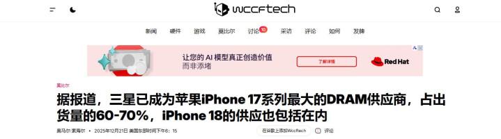 据Wccftech引用《韩国经济日报》报道,三星已成为iPhone 17及iPhone 18系列最大的DRAM供应商,占出货量的60-70%