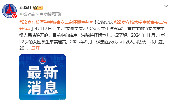 4月17日上午,“安徽安庆22岁女大学生被害案”二审在安徽省安庆市中级人民法院开庭,目前庭审结束,法院将择期宣判。据了解浙江股票配资,2024年11月,时年22岁的女医学生李某遇害。2025年9月,该案在安庆市中级人民法院一审开庭。2026年1月,该案一审宣判,嫌疑人林某某被判死刑。